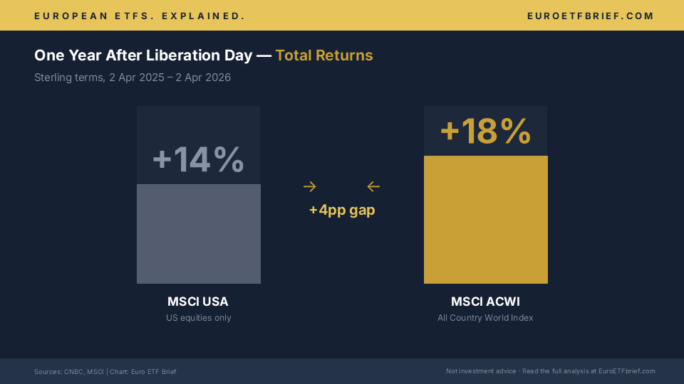 One year after “Liberation Day,” the MSCI All Country World Index has returned 18% in sterling terms — outpacing the MSCI USA’s 14%. The US exceptionalism trade has cracked.