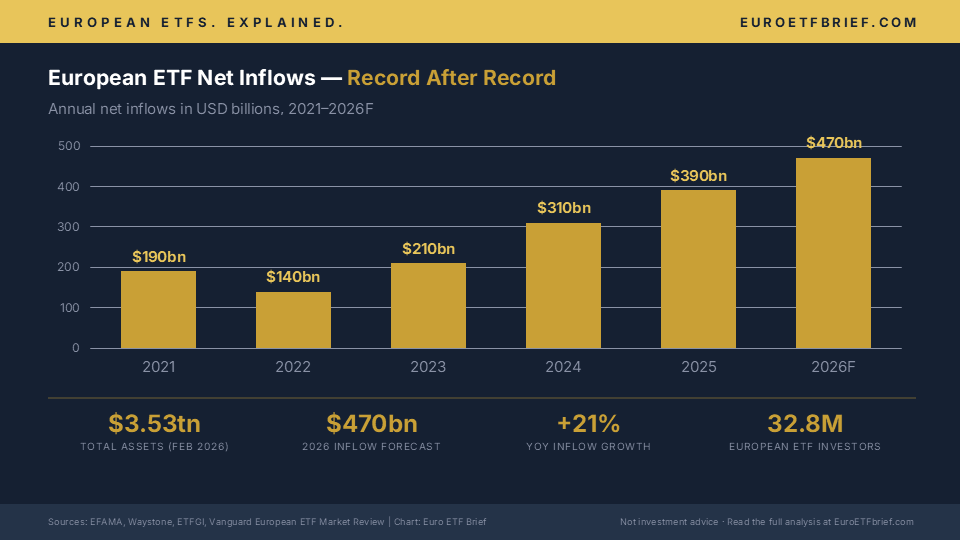 European-domiciled ETF assets have surged from $3.22 trillion to $3.53 trillion in 2026 alone, with record inflows of $470 billion forecast for the full year.