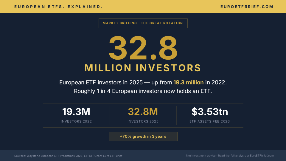 The investor base is growing just as fast. Europe now counts 32.8 million ETF investors, up from 19.3 million in 2022. Roughly one in four European investors holds an ETF — a milestone that would have seemed optimistic just three years ago.